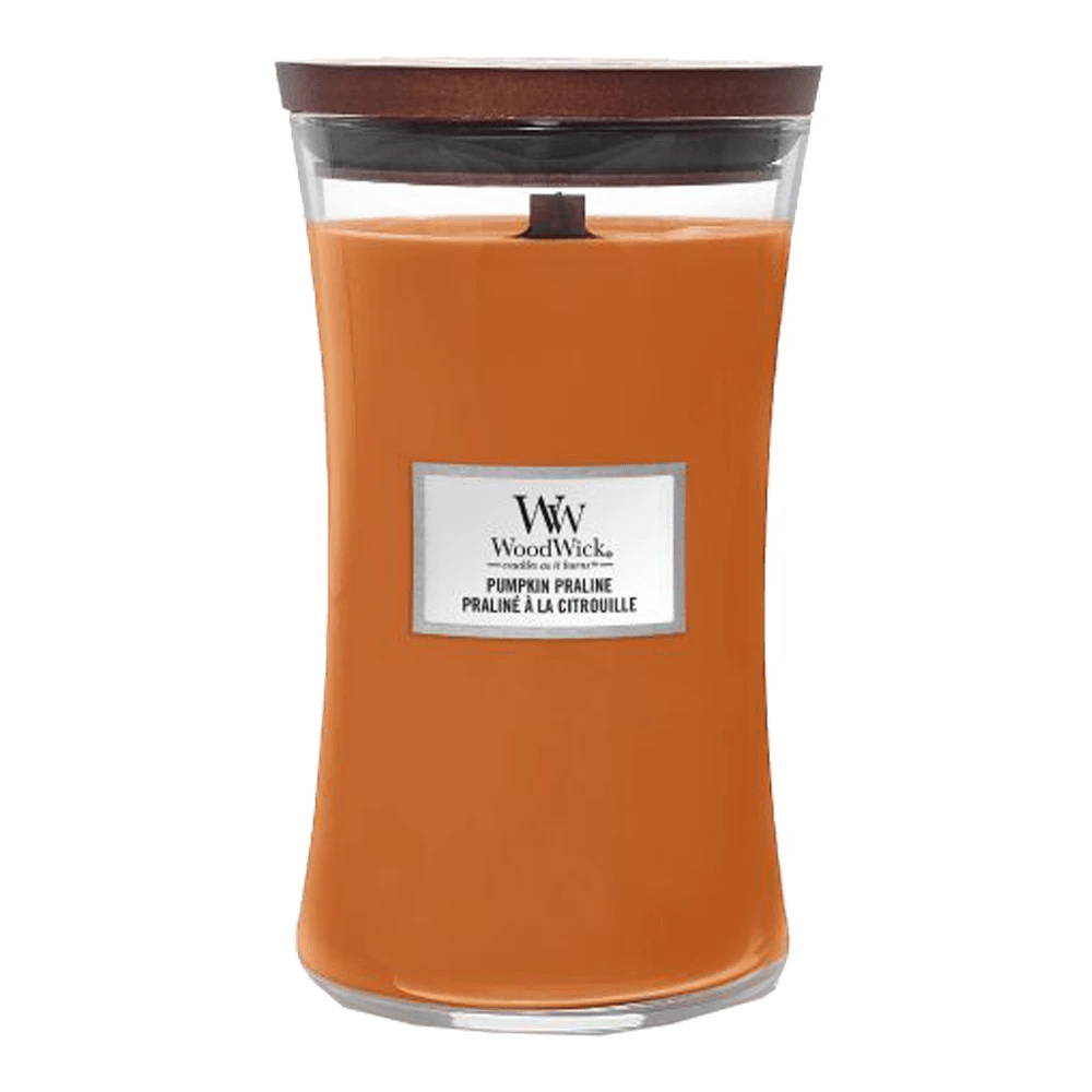 Details van de Woodwick Pumpkin Praline geurkaars: