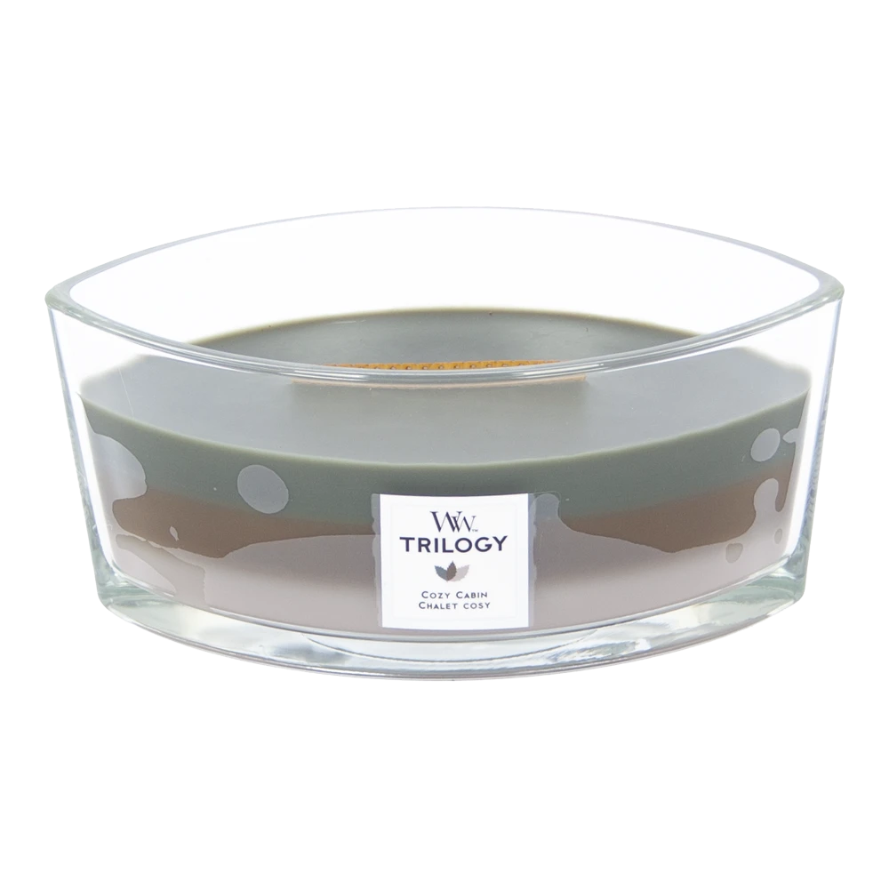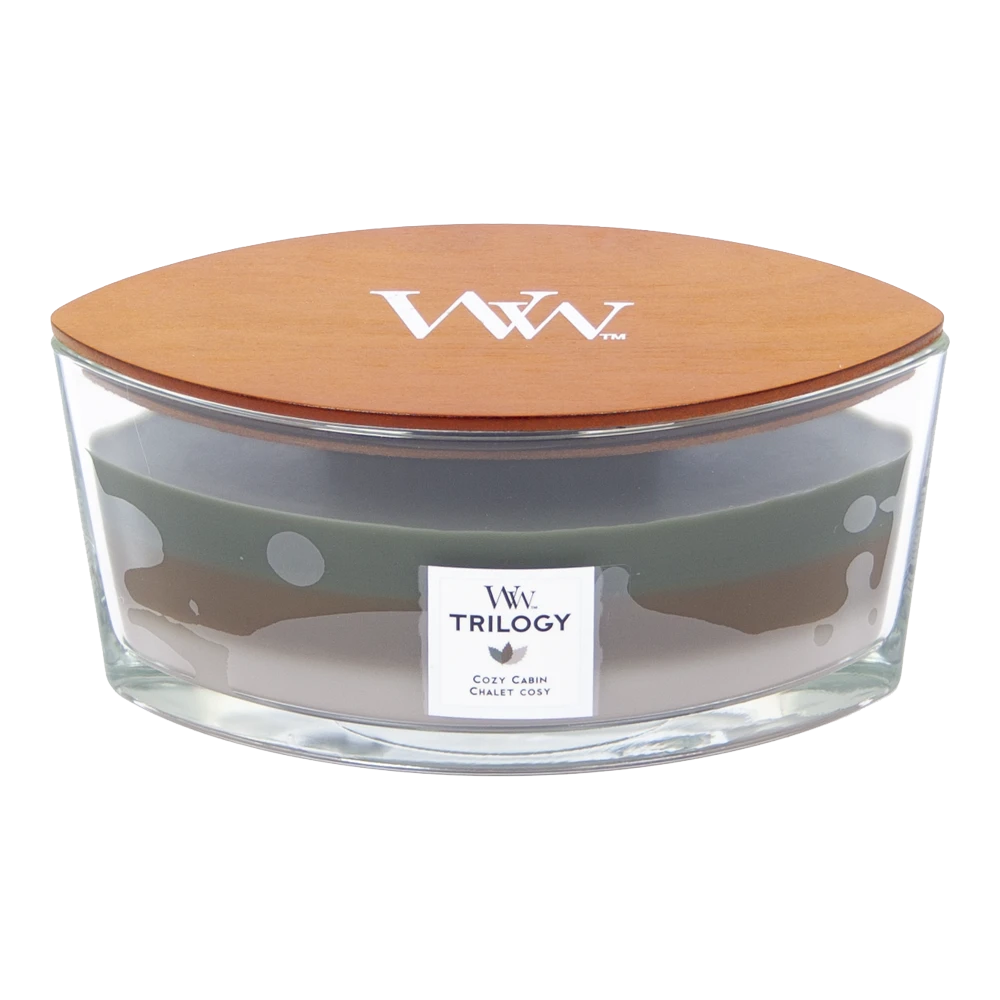 Details van de Woodwick Trigoly Cozy Cabin geurkaars: